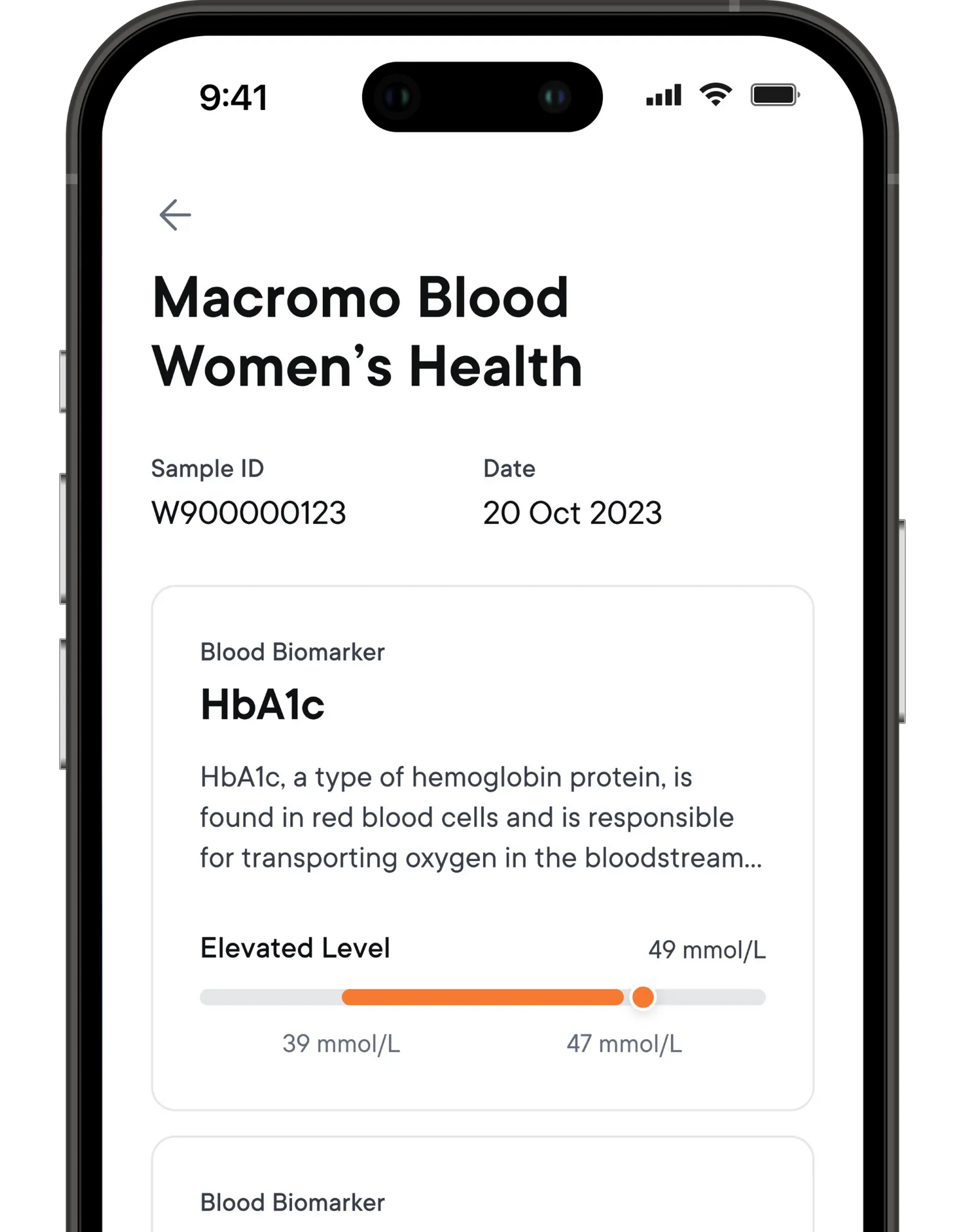 Our Women's health blood test is designed for all women aged 18 and above who want to take better care of their health. By monitoring key biomarkers for women’s health over time, you can detect potential health issues early and make informed choices for a healthier future. With Macromo blood tests, you gain peace of mind knowing that your most valuable asset – your health – is in good hands.