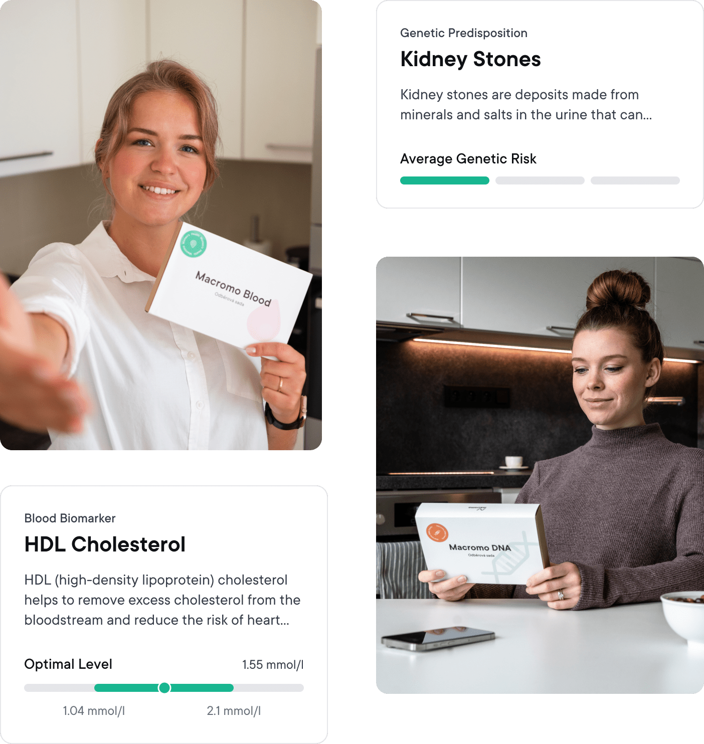 Macromo offers a complex approach to disease prevention, combining your genetic predispositions to certain diseases; blood work to assess your current health state; family history and lifestyle data. We believe that knowledge is power and when you have a complete picture, you can take actionable steps to prevent numerous diseases through lifestyle changes and regular monitoring.